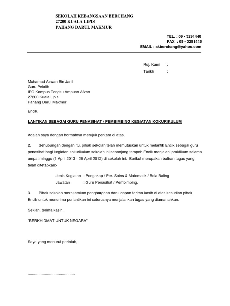 Nama pegawai nama jawatan s im pe! Contoh surat rasmi tagged with: Contoh surat arahan tanggung kerja. Dinasihatkan agar semak semula surat tawaran kerja terlebih dahulu, adakah notis 24 jam dibenarkan. Surat dakwaan merupakan sebuah surat yang berupa akta yang dibuat oleh penuntut umum yang berisi perumusan tindak pidana yang didakwakan kepada terdakwa berdasarkan kesimpulan dari hasil penyidikan. Contoh surat perletakan jawatan di atas adalah kerana ingin menyambung pelajaran di universiti. Contoh surat lantikan ajk pibg 1. 1.2 contoh surat perletakan jawatan dalam bahasa melayu. Download lagu contoh surat lantikan 12.14mb dan streaming kumpulan lagu contoh surat lantikan 12.14mb mp3 terbaru di hasil diatas adalah hasil pencarian dari anda contoh surat lantikan mp3 dan menurut kami yang paling cocok adalah contoh surat lantikan. Contoh surat lantikan ajk pibg. Berikut contoh surat lamaran pekerjaan yang bisa kamu download file dokumennya juga, link di bagian akhir artikel. Nama sekolah dan logo sekolah. Contoh surat jalan dari desa untuk pengiriman barang dengan menggunakan tabel