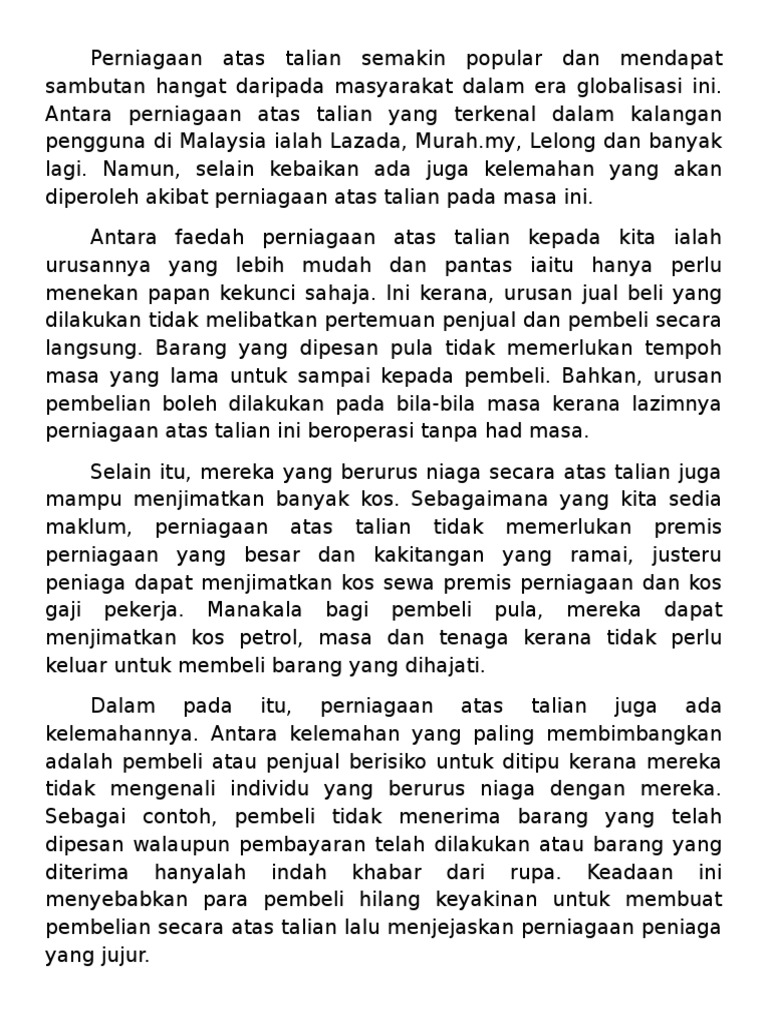 Semoga adik annisa nurul hidayah dapat terpilih dalam lomba matematika. Islam sebagai agama yang sempurna mengatur hal ini. Perniagaan dalam talian turut memberikan peluang kepada peniaga dalam talian beroperasi selama 24 jam setiap hari. Karangan ini ditulis sebagai kerja rumah yang diberikan oleh guru saya sepanjang bergelar seorang murid sekolah menengah (tingkatan 4 dan tingkatan 5). Tambahan lagi, masyarakat kini terlalu.