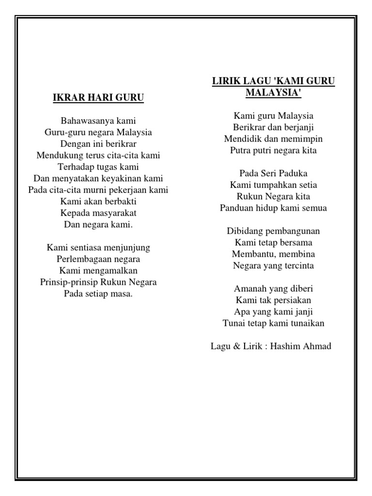 3 from Amanah yang diberi kami tak persiakan apa yang kami janji tunai tetap kami tunaikan. Kami guru malaysia berikrar dan berjanji mendidik dan memimpin putera puteri negara kita. Lirik lagu guru malaysia kami guru malaysia berikrar dan berjanji mendidik dan memimpin putra putri negara kita pada seri paduka kami tumpahkan setia rukun negara kita panduan hidup kami semua di bidang pembangunan kami tetap bersama membantu, membina negara yang tercinta amanah yang diberi Pada seri paduka kami tumpahkan setia rukun negara kita panduan hidup kami semua di bidang pembangunan kami tetap bersama membantu membina negara yang tercinta. For more information and source, see on this link : Kami guru malaysia # smktu2 # ts25. Malaysia guru lagu lirik dengan perlis kpli ipgm. Lirik lagu kami guru malaysia (lagu hari guru) kami guru malaysia.